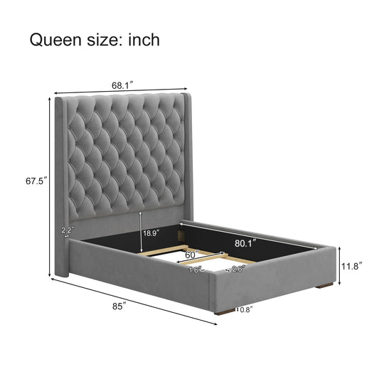 Velvet Button Tufted-Upholstered Bed With Wings Design Strong Wood Slat Support Queen Platform Bed - Gray