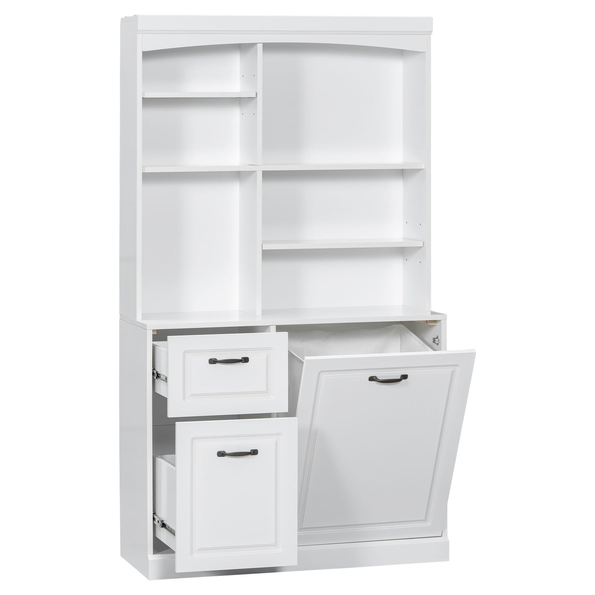 Bathroom Storage Cabinet With Tilt Out Hamper, Tall Free Standing Organizer With Drawers & Adjustable Shelves, Linen Tower With Steel Handles - White