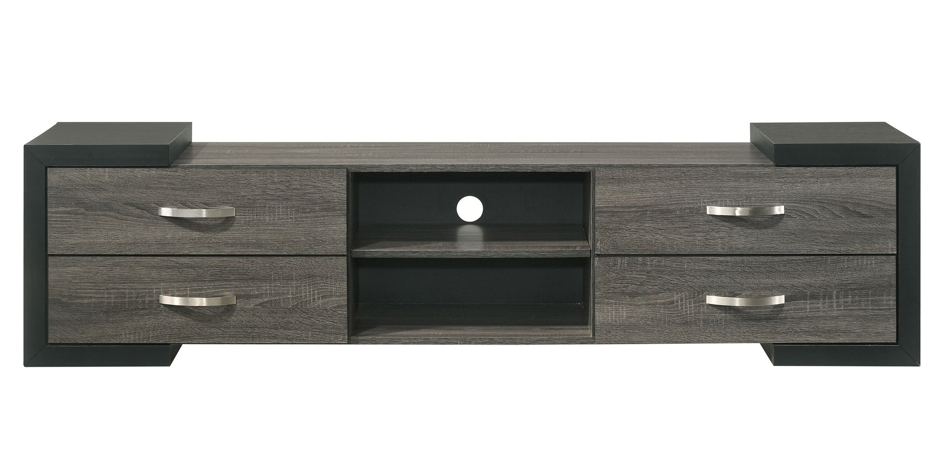 Discover the epitome of modern elegance with this stylish entertainment console, a perfect blend of contemporary design and functionality. Crafted with sleek, dark tones and complemented by bold black accents, this console exudes a sophisticated charm that effortlessly enhances any living space. The spacious surface accommodates your large flat-screen TV while the four roomy drawers provide ample storage for all your media essentials, ensuring a clutter-free environment. Central open shelves are perfect for displaying your favorite decor pieces or housing your gaming consoles and media players. Finished with brushed metal handles for a touch of industrial flair, this entertainment console is not just a piece of furniture—it's a statement of refined taste and practical luxury.