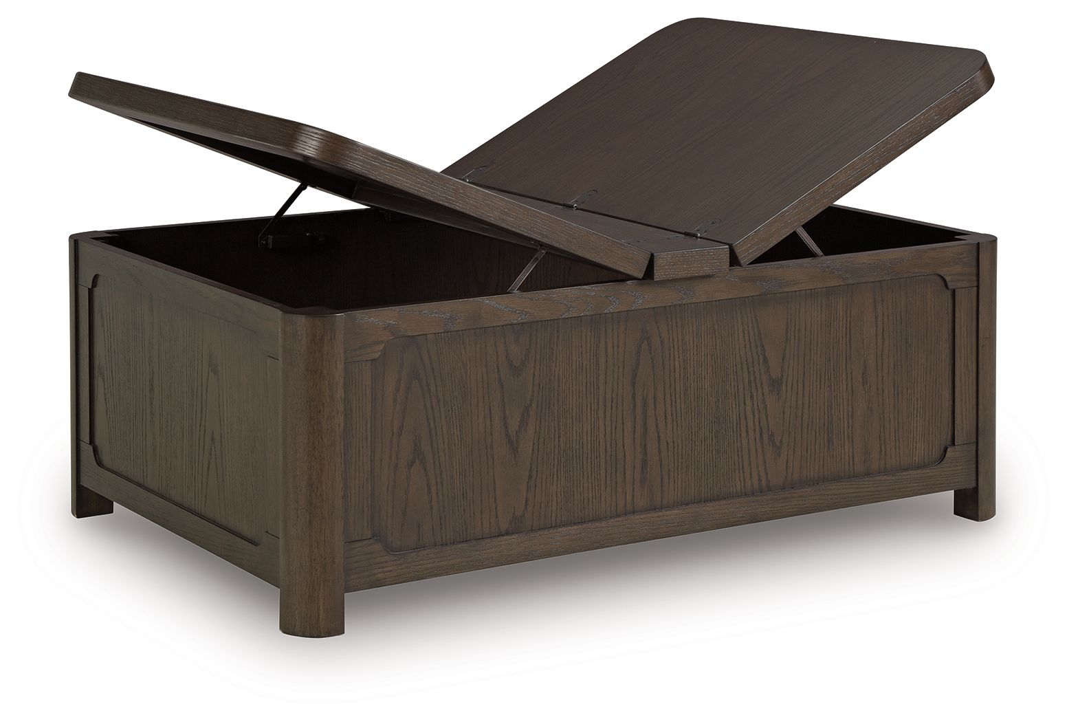 If casual contemporary style is your thing, then you'll love this coffee table with storage. Its thick tabletop, softly rounded corners and rich wood-tone finish lend a soothing sensibility. A deep trunk cabinet offers plenty of room to store extra pillows, blankets and anything else you want to tuck out of sight. Sleek and smart, this piece is a fresh take on cool for the modern home.