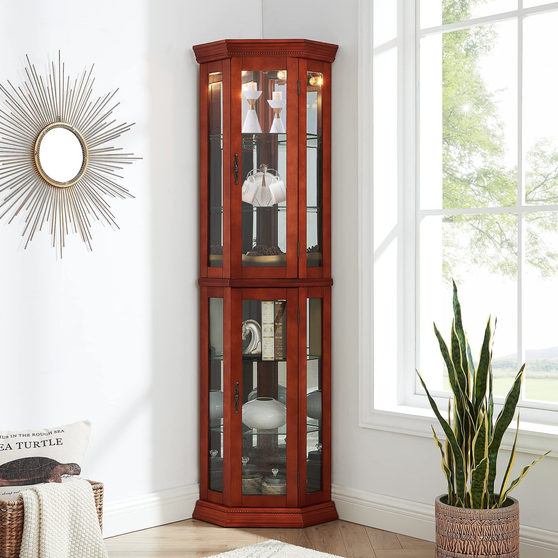 Corner Curio Cabinet With Lights, Adjustable Tempered Glass Shelves, Mirrored Back, Display Cabinet (E26 Light Bulb Not Included) - Cherry