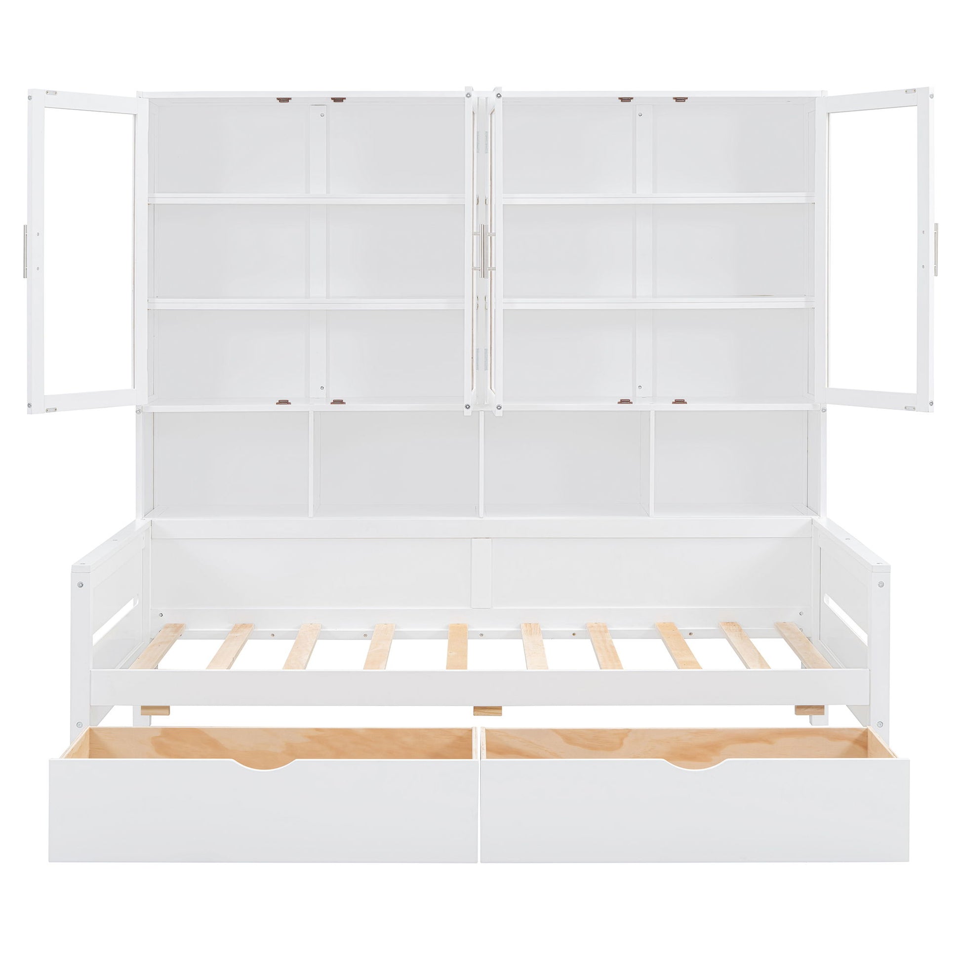 Full Size Daybed With Glass Door Storage Cabinets, Built In LED Lighting And Shelves - White
