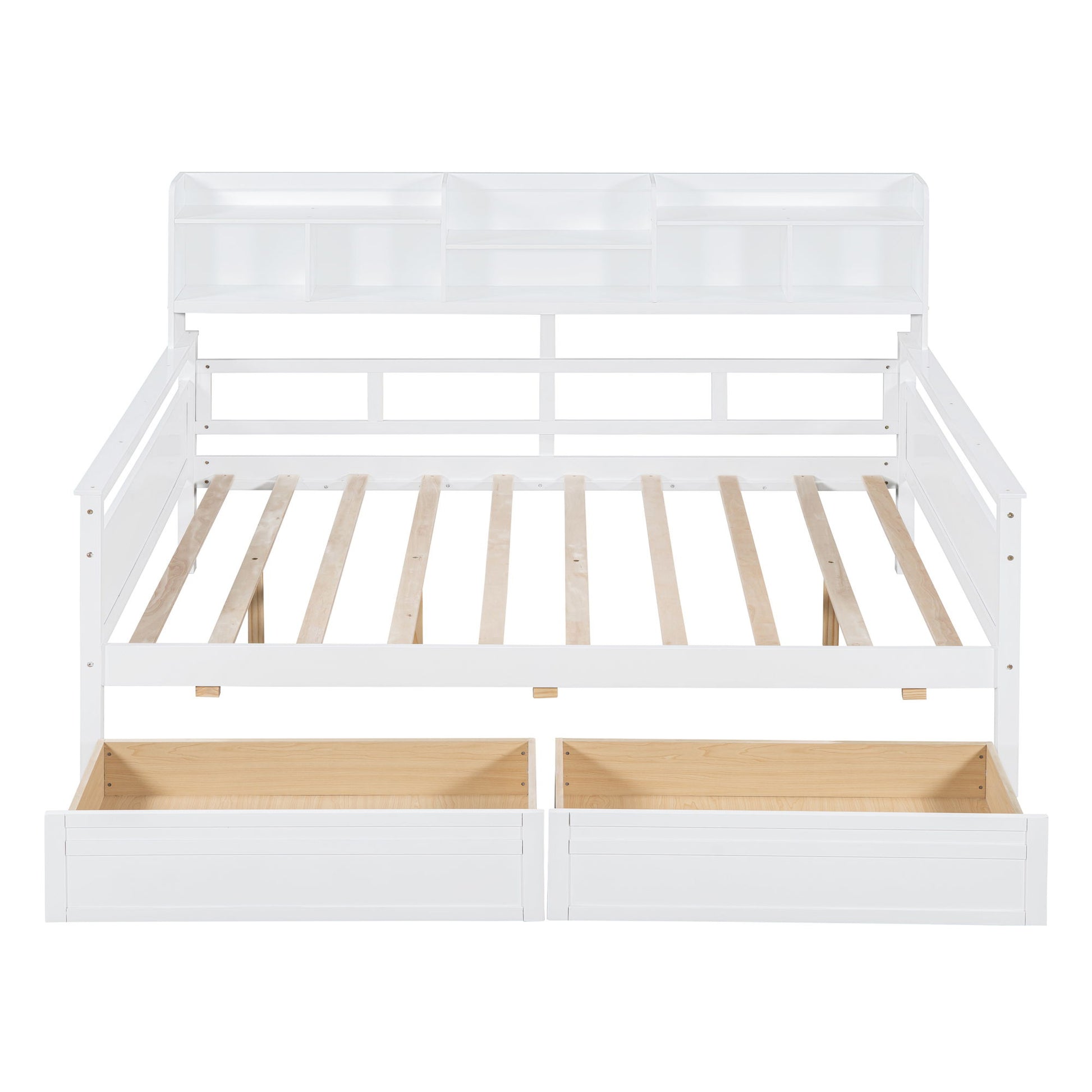 Full Size Daybed, Slat Support, With Bedside Shelf And Two Drawers - White