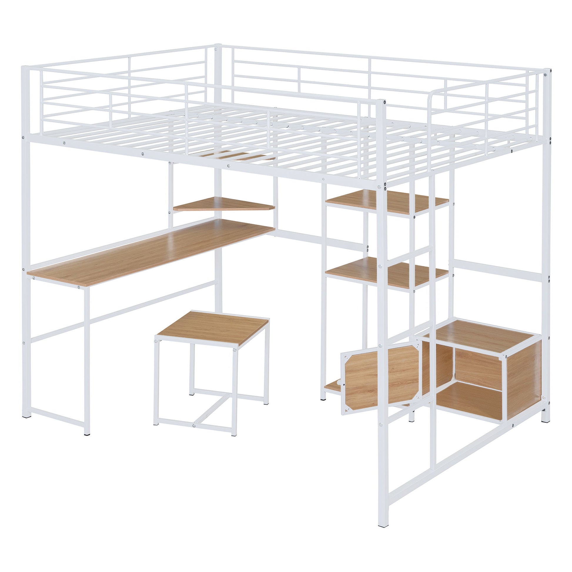 Full Size Loft Bed With Desk And Stool, With Open Style Wardrobe, Shelves And Cabinet - White