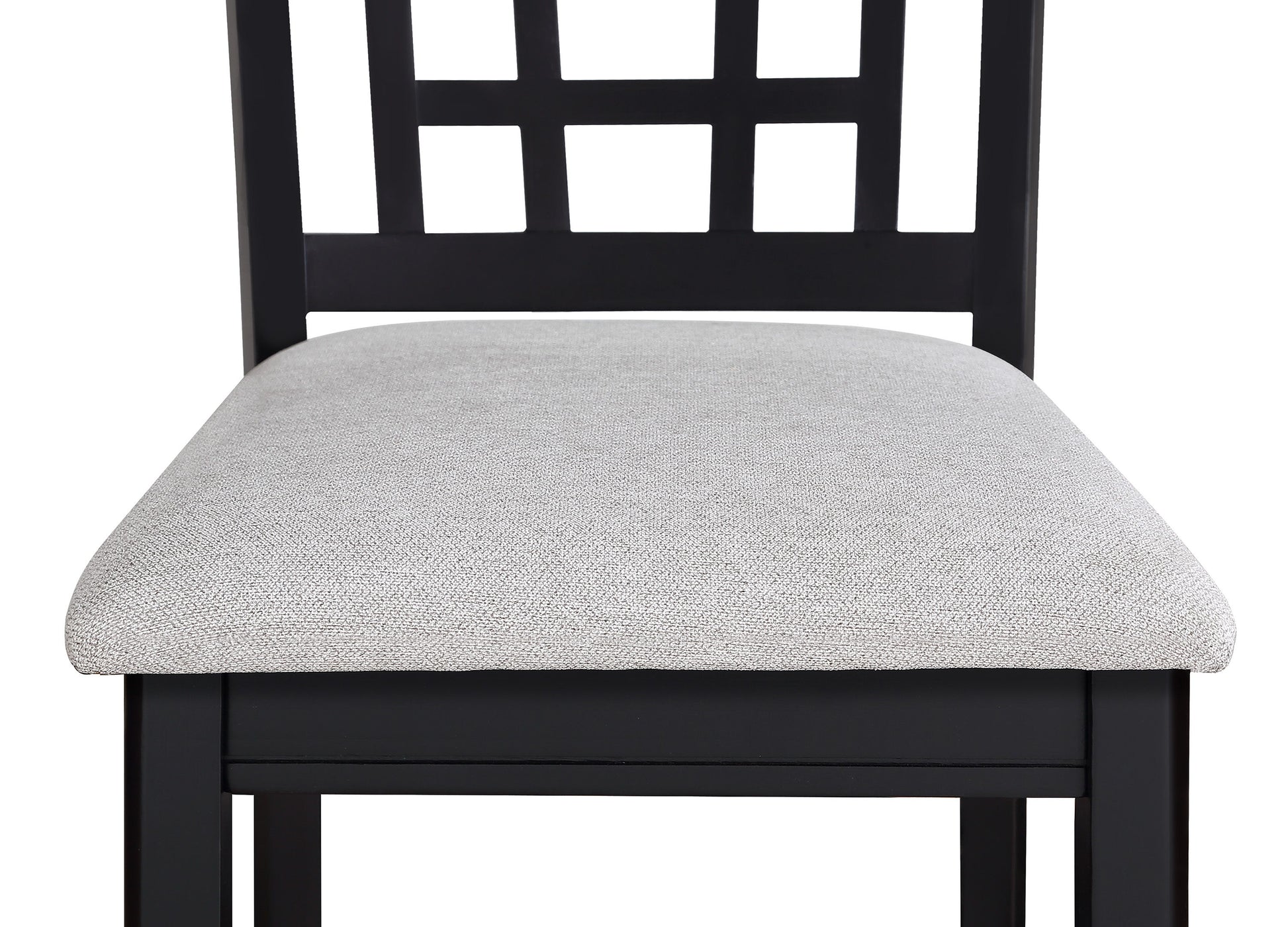 Discover practicality and style with our dining group. With a straightforward design, this set is perfect for everyday meals and casual gatherings. The grid-back chairs offer supportive seating, while the cushioned seats ensure comfort. With its under-table shelf, the table provides a handy spot for dining essentials.