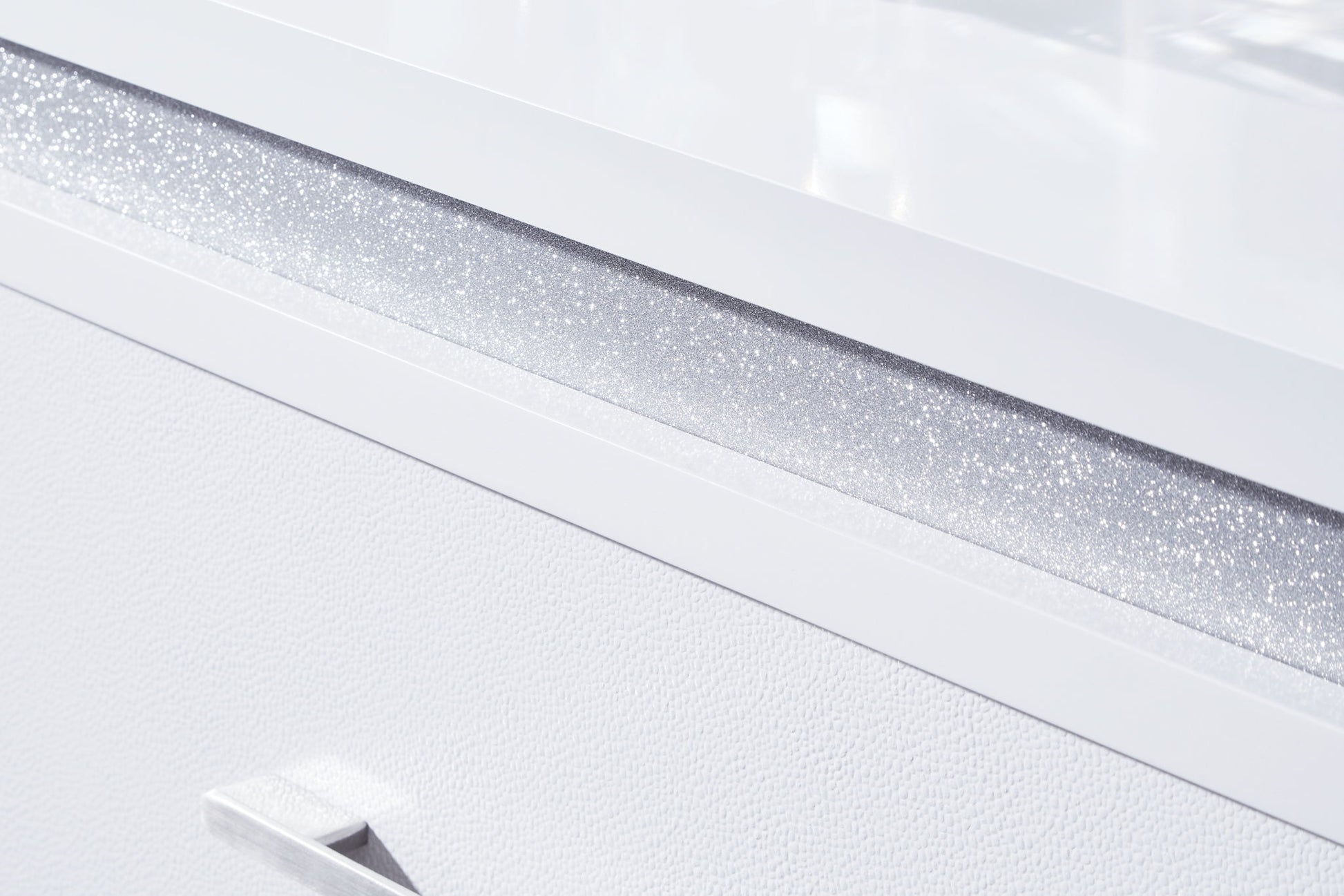 This dresser with mirror is a showstopper, bringing a touch of modern glamour to your sanctuary. A sleek white finish and inset glitter accents create a luxurious feel, while six spacious drawers provide ample storage for your wardrobe. The mirror’s built-in LED lighting adds a soft glow, making it even easier to get ready in the morning or wind down at night. It’s a simply stunning way to achieve the bedroom of your dreams.