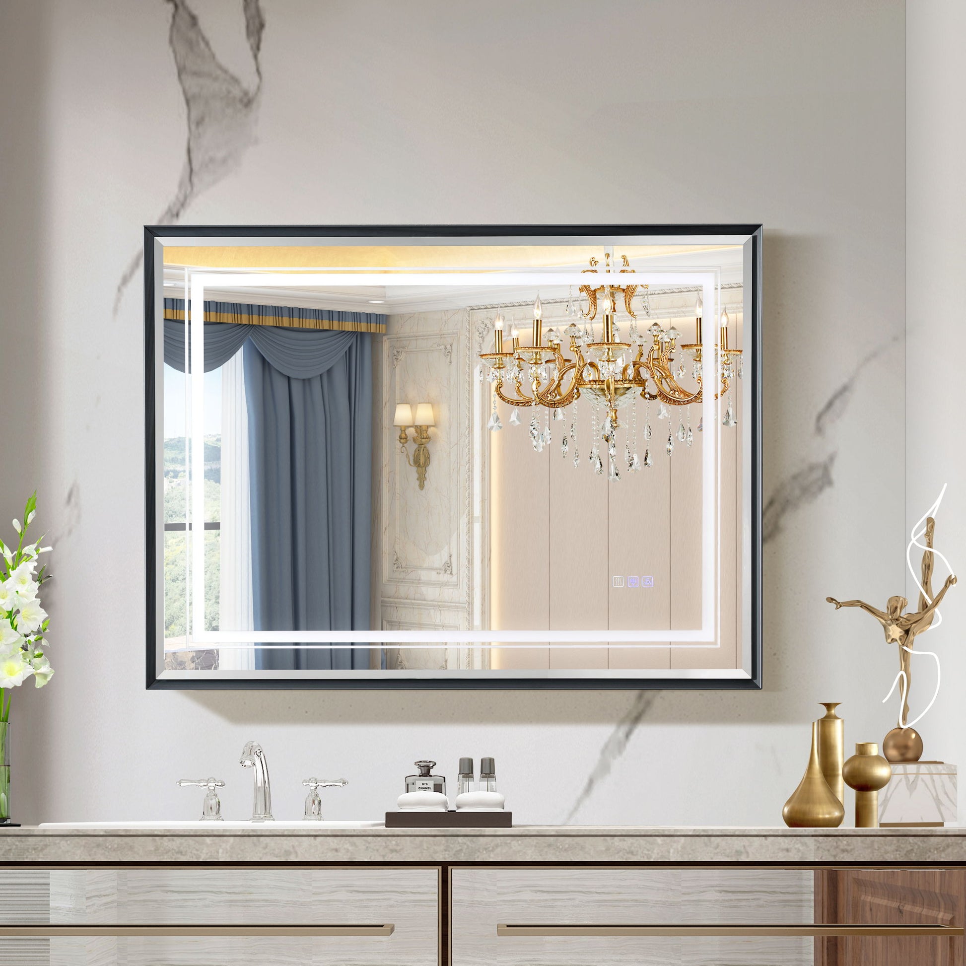 - Elegant Design: Featuring smooth aluminum frame lines and a three-dimensional beveled edge lens, this mirror enhances the bathroom's ambiance with front and side lighting, creating a sophisticated double-layer lighting effect.