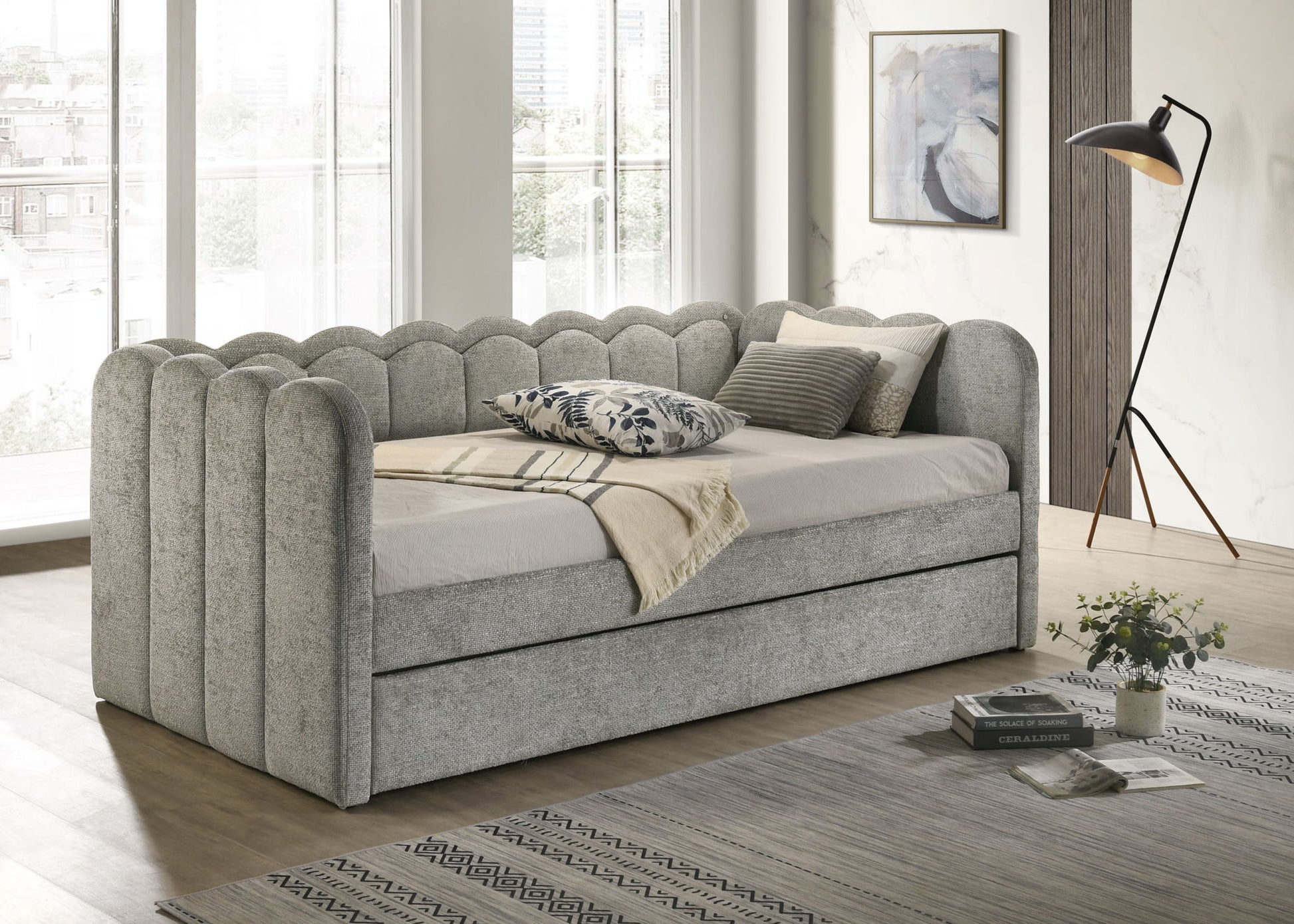 Experience the perfect blend of comfort and sophistication with this elegantly designed piece, crafted to bring both style and functionality to your space. Featuring a plush, scalloped silhouette with integrated LED lighting, this luxurious addition creates a soft and inviting ambiance, while the beautifully upholstered frame enhances its refined aesthetic. Designed with versatility in mind, it offers a spacious sleeping area and an integrated pull-out trundle, making it ideal for maximizing space without compromising on elegance. Whether placed in a bedroom, guest room, or lounge area, this stunning design effortlessly transforms any setting into a chic and cozy retreat.