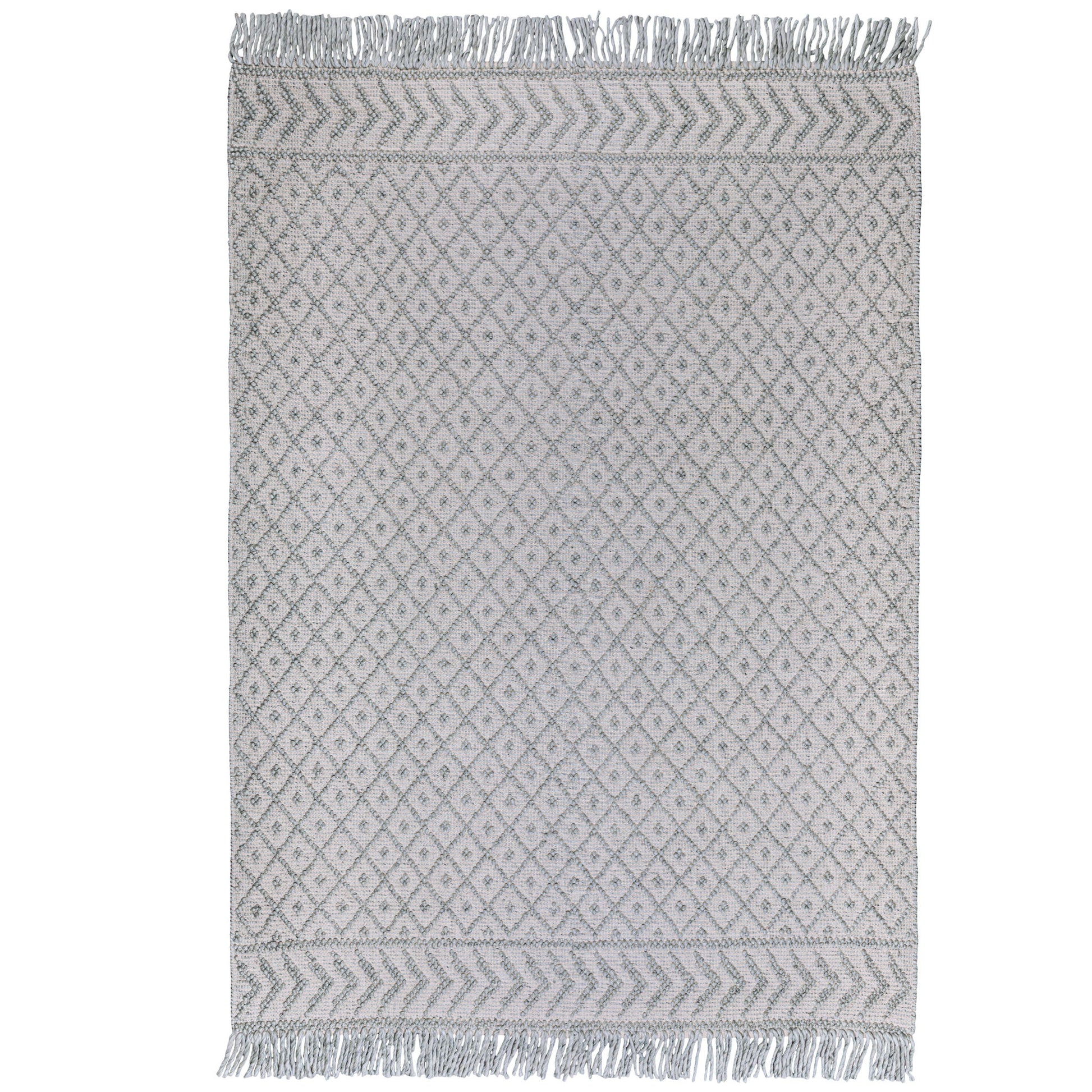 - Detailed with a geometric pattern in silver grey featuring a hand-knotted fringe