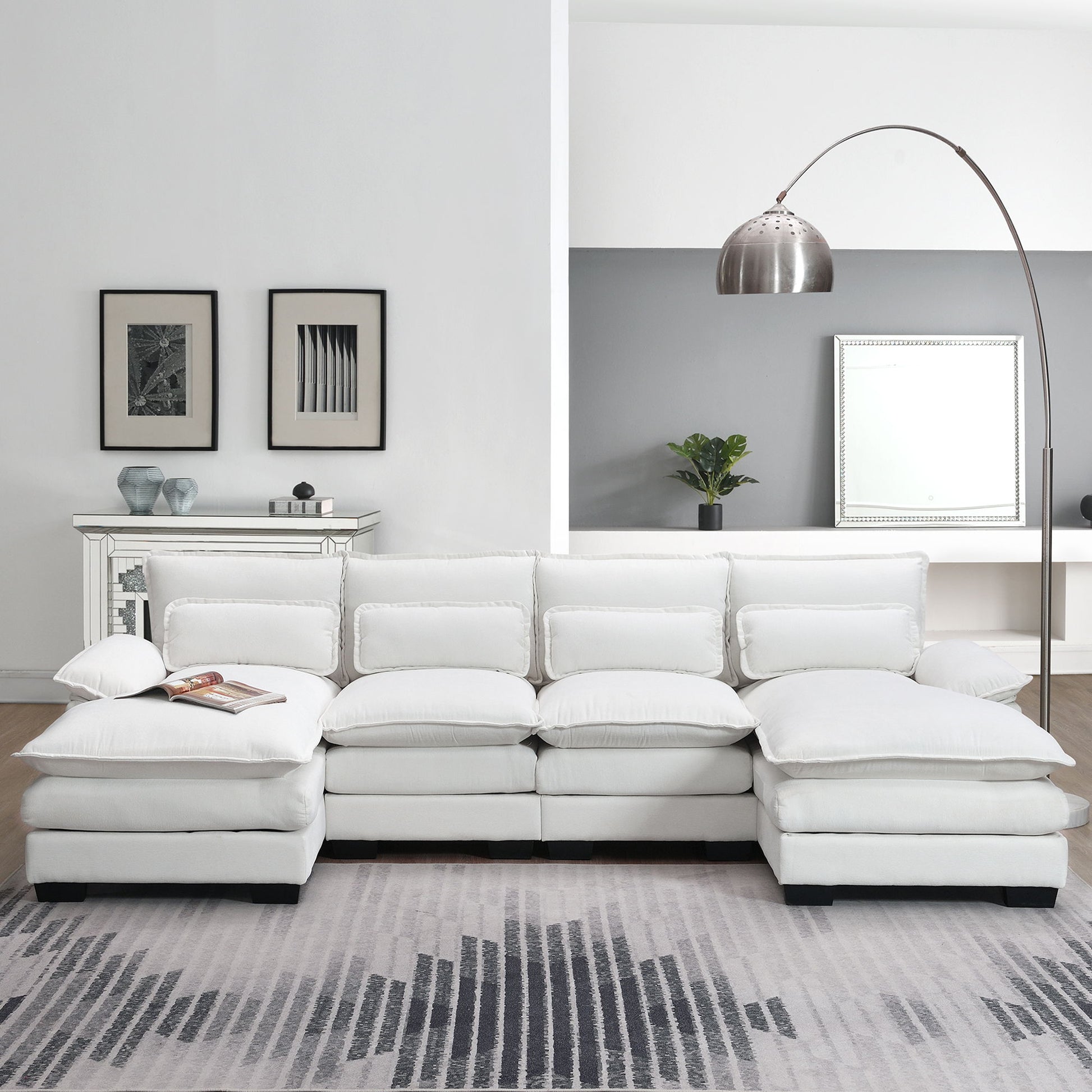 Modern U-Shaped Sectional Sofa With Waist Pillows, 6 Seat Upholstered Symmetrical Sofa Furniture, Sleeper Sofa Couch With Chaise Lounge - White