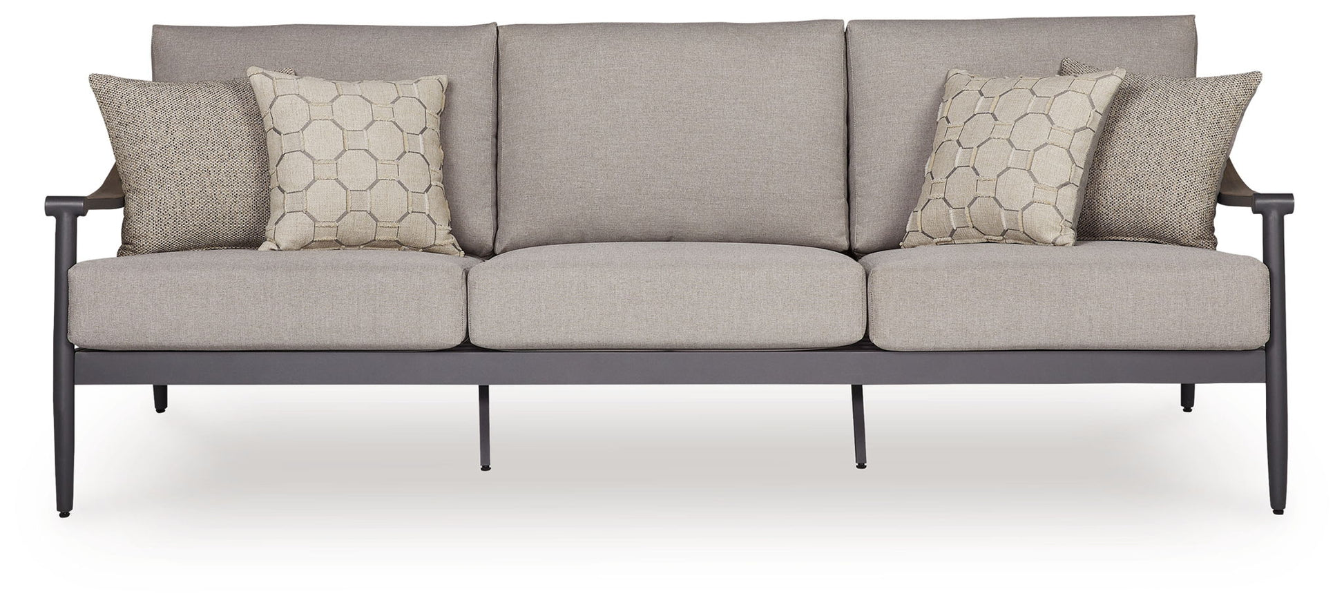 A refined marriage of style and durability, this outdoor sofa adds contemporary flair to your porch or patio. Shades of gray and wood tones lend a versatile, neutral appeal. And it's built to last, with a rust-resistant frame and cleanable, UV-resistant fabric.