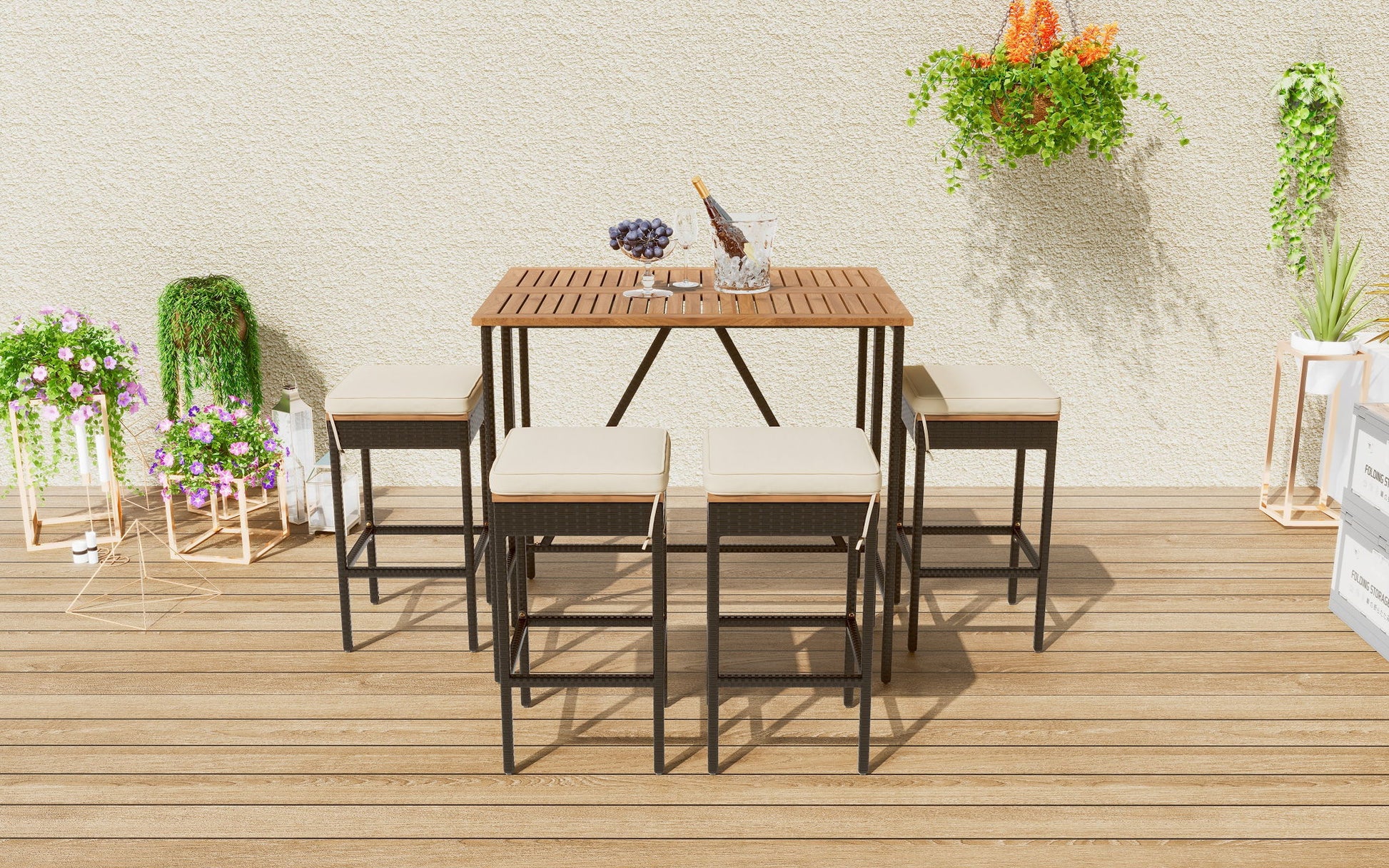 5 Piece Outdoor Acacia Wood Bar Height Table And 4 Stools With Cushions, Garden Wicker Dining Table, Foldable Tabletop, High Dining Bistro Set, All-Weather Patio Furniture - Brown