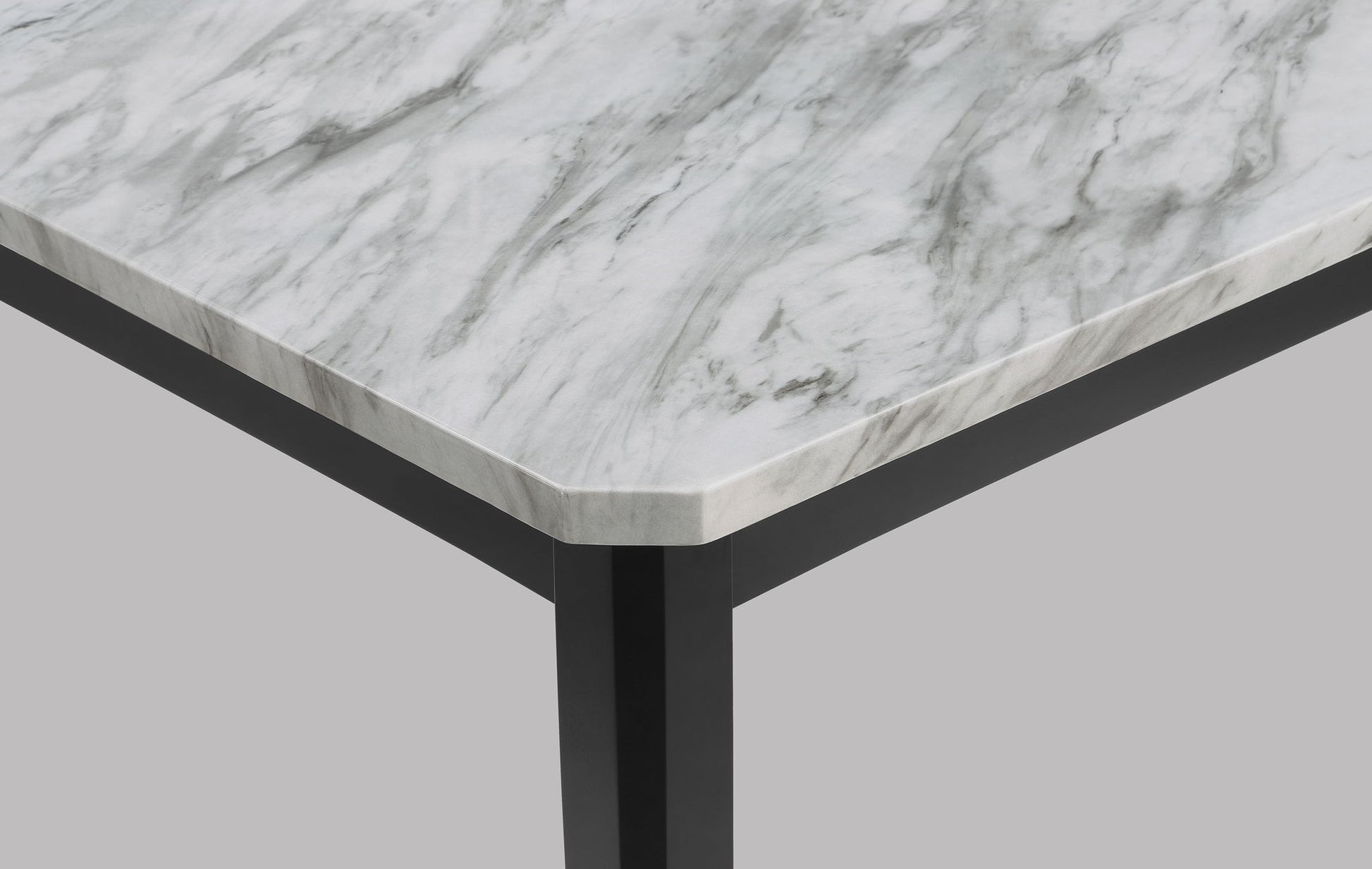 Elevate your dining space with this luxurious and modern counter height dining group, designed to bring elegance and sophistication to every meal. The stunning faux-marble tabletop offers a sleek and polished look, beautifully complemented by the bold frame for a striking contrast. The plush, velvet-upholstered chairs and bench feature chic vertical channel tufting, providing both comfort and contemporary flair. Perfect for hosting dinner parties or enjoying everyday meals, this set seamlessly blends style and functionality. With its refined aesthetic and durable craftsmanship, it’s the perfect addition to any modern home looking for a touch of glamour.