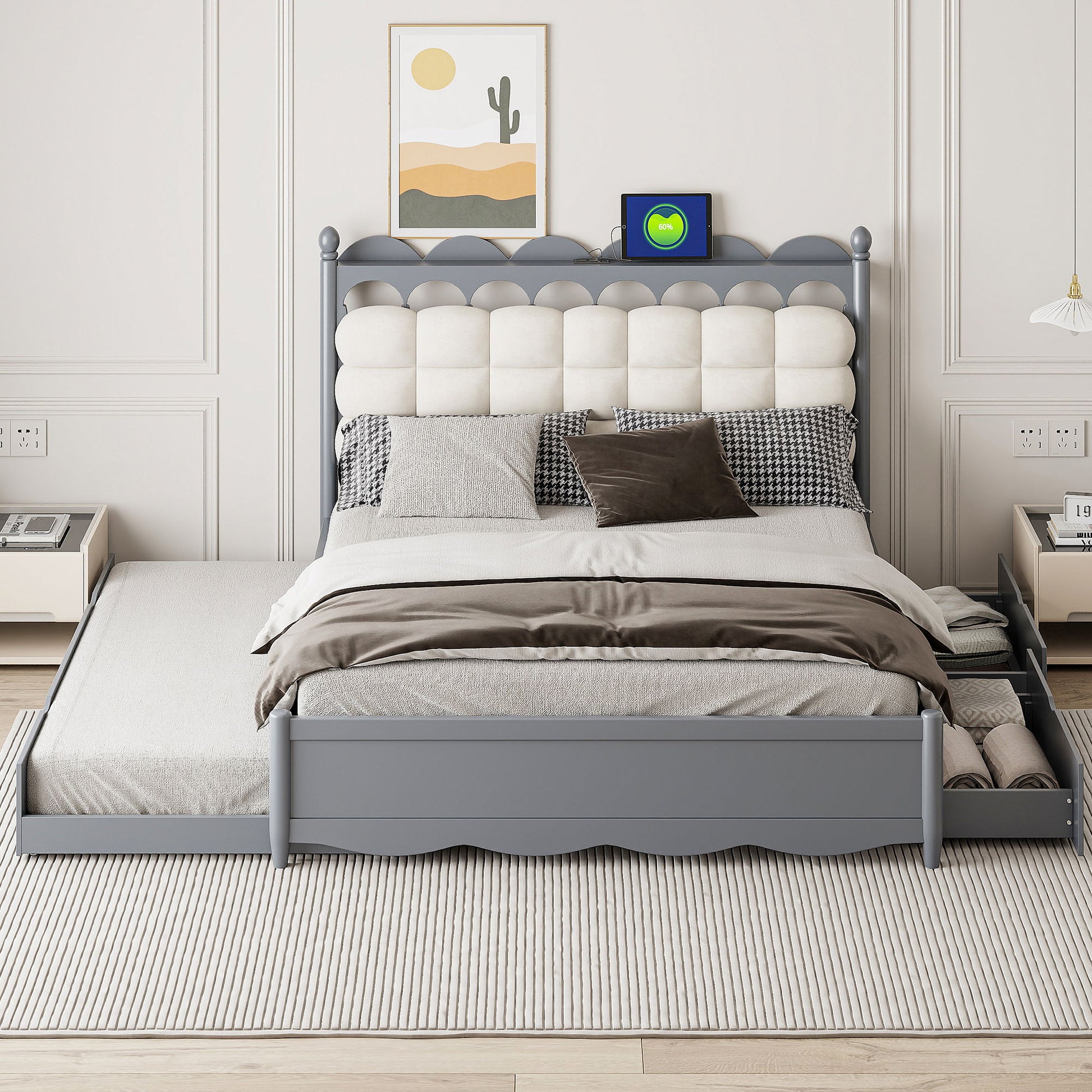 Queen Size Storage Platform Bed, With 2 Big Drawers, Twin Long Size Trundle, One Set Of Sockets & USB Ports - Gray