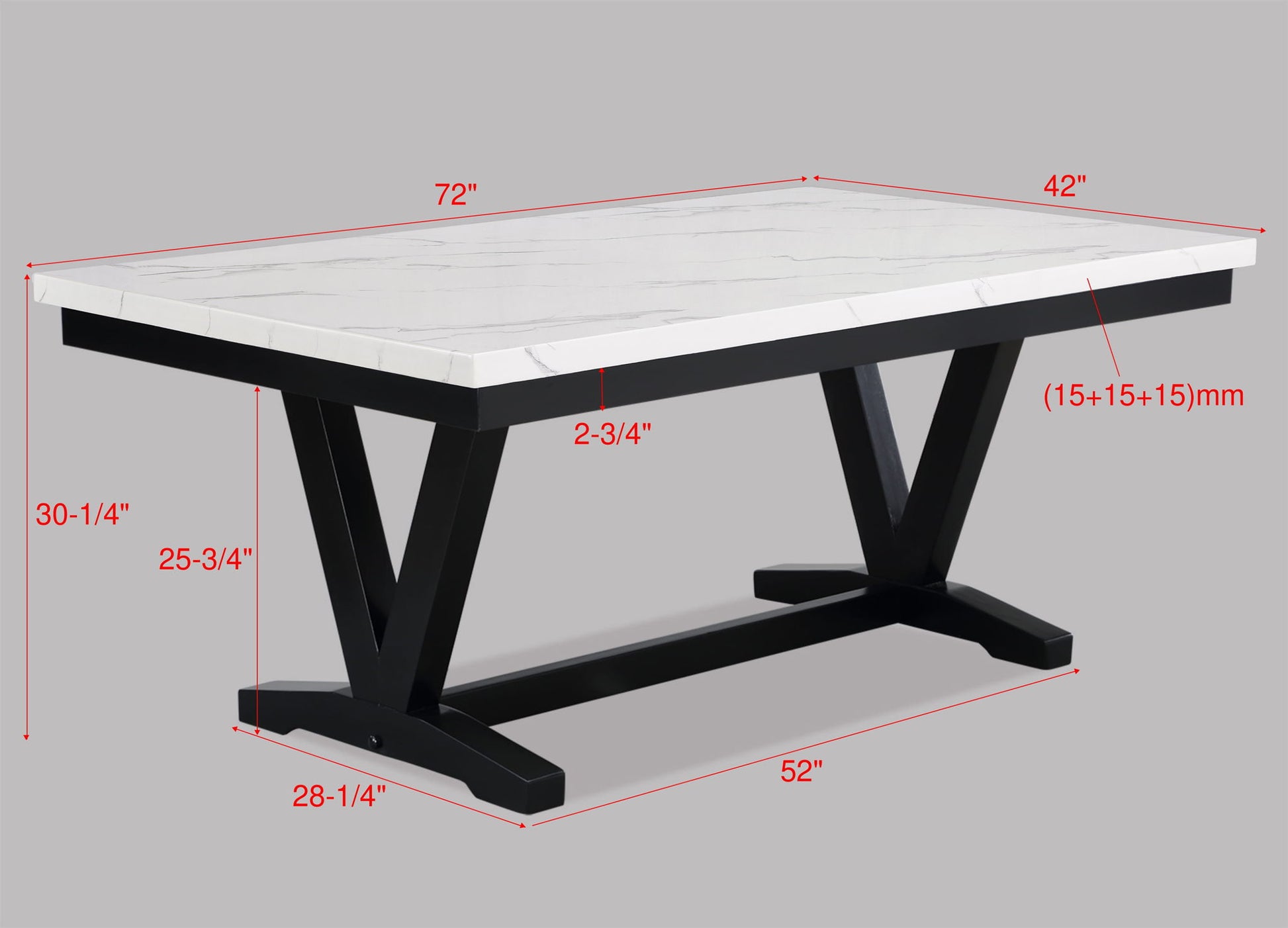 Introducing a harmonious blend of modern sophistication and classic elegance. This dining set showcases a refined faux marble tabletop supported by a distinctively designed black trestle base, creating a striking contrast. Accompanied by sleek chairs, accented with nailhead trim and dressed in a chic leatherette upholstery, this ensemble is a testament to understated luxury. The additional bench seating option promotes communal dining and adds versatility.