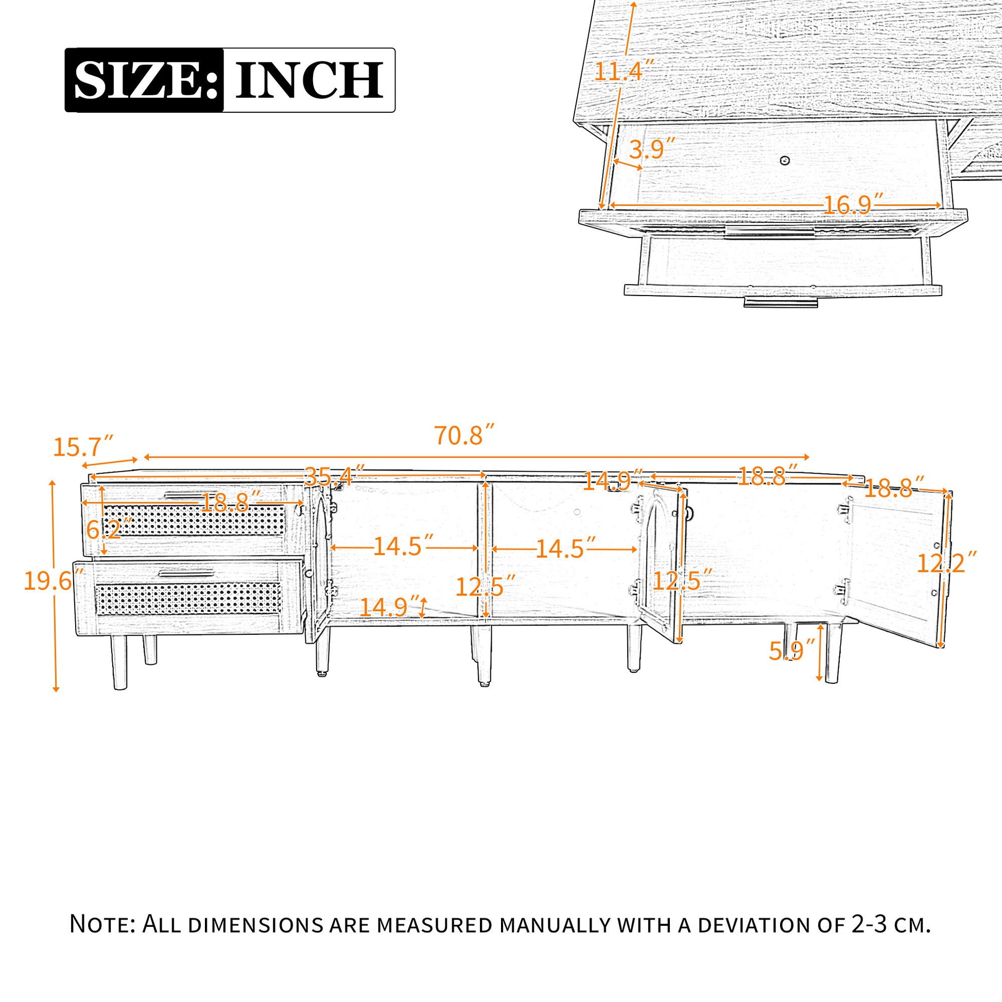 Rattan TV Stand With 3 Cabinets & 2 Drawers, Rattan-Inspired Media Console Table For Tvs Up To 80'', LED Light Entertainment Center, TV Cabinet For Living Room - Black