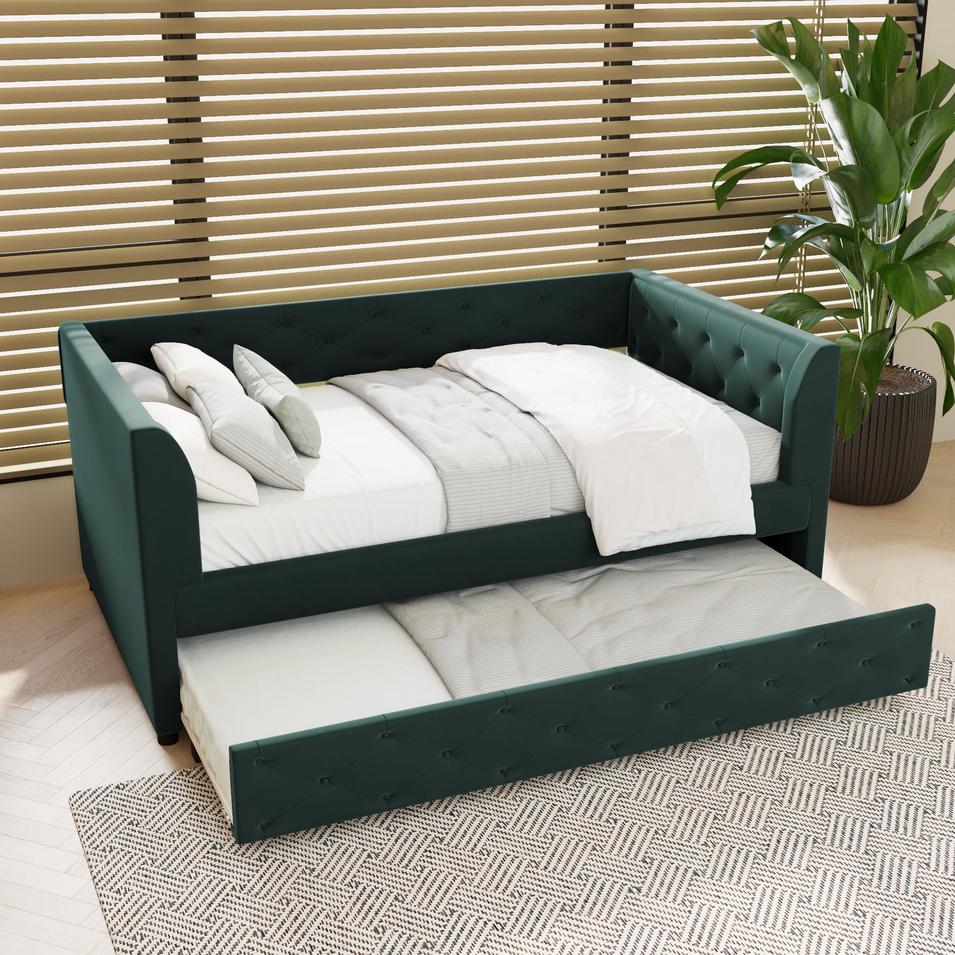 Twin Size Upholstered Tufted Daybed With Trundle - Green