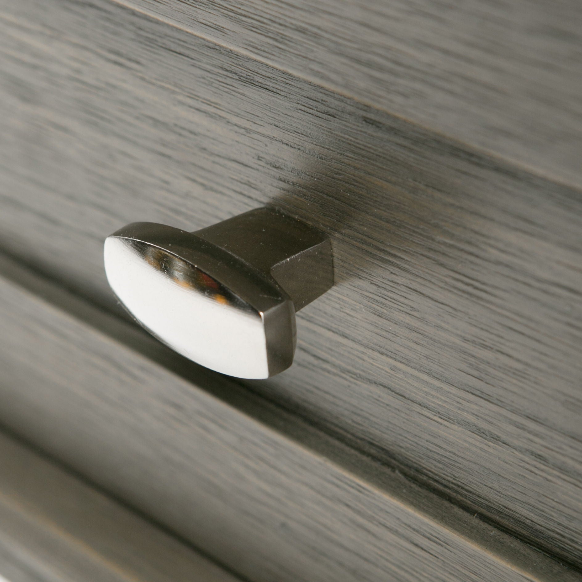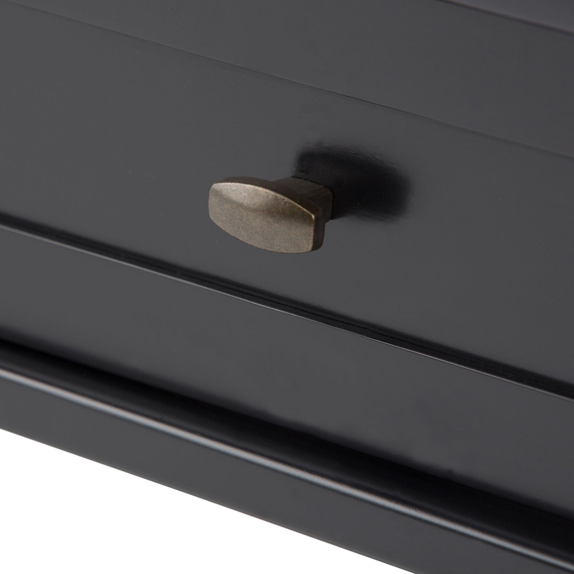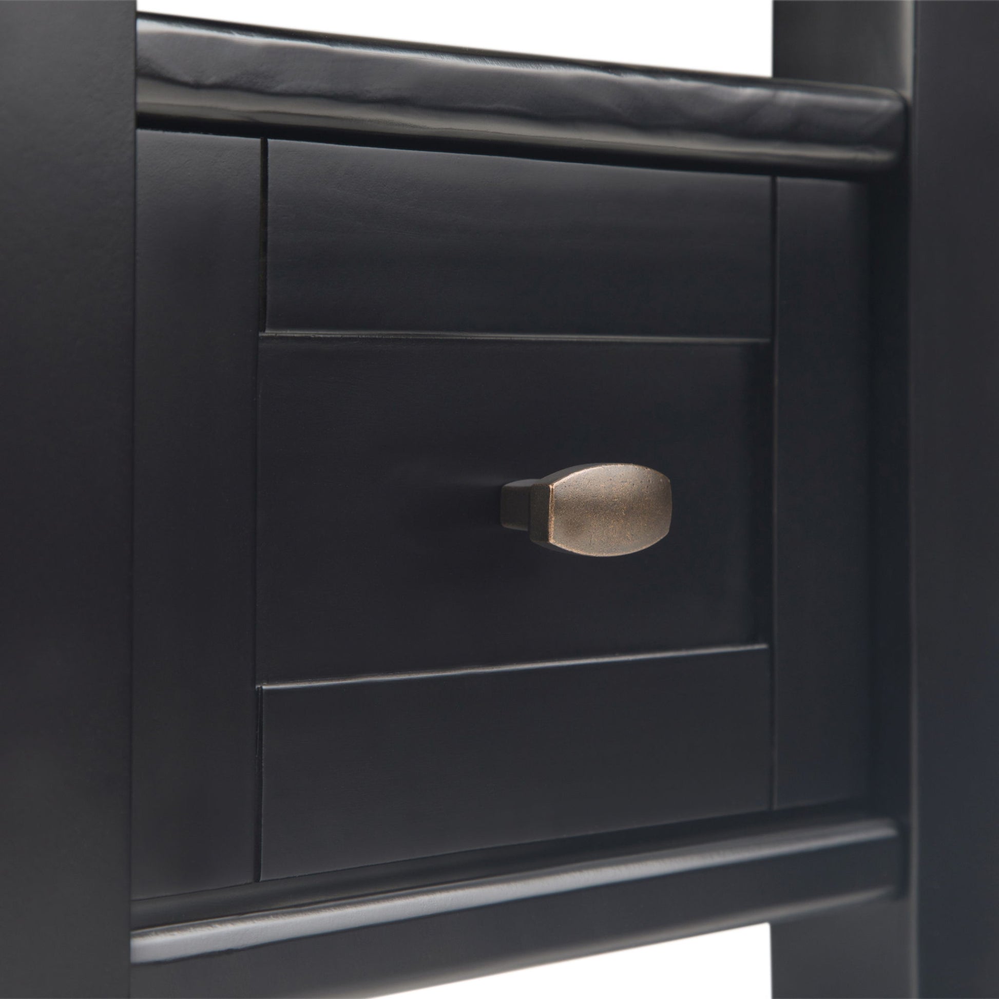 - Features bottom drawer with metal drawer glides and large open shelf for storage